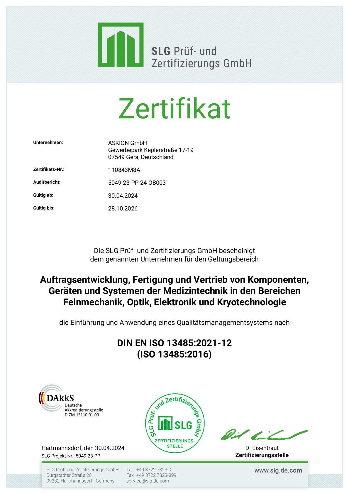 Alle unsere Prozesse in Entwicklung und Produktion genügen höchsten Ansprüchen an die Qualitätssicherung. Entsprechend den gestiegenen regulatorischen Anforderungen in Medizintechnik und Diagnostik haben wir unser Angebotsportfolio zur technischen Zulassung und der Erstellung der notwendigen Dokumentationen weiter ausgebaut. Wir entwickeln konform zur Medical Device Regulation (MDR 2017/745).